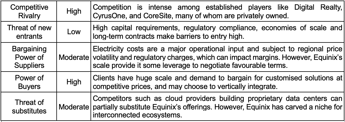 Capital Expenditures for Expansion and Development: A significant portion of costs stem from active investments in expanding the global footprint through new data centers, acquisitions, and upgrades. Capital investment represents a major ongoing cost as Equinix builds new data centers and expands existing ones to support growth, especially AI and cloud-related infrastructure requirements. The company’s capex was approximately $3.0 billion in 2024 and is forecast to increase to $4-5 billion annually by 2027, reflecting an aggressive expansion strategy.