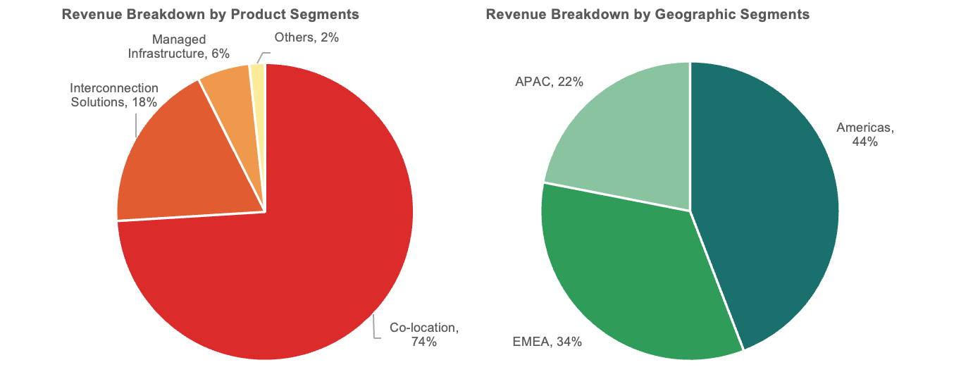 Equinix operates through three primary business segments, which are categorised based on geographic regions: Americas, EMEA (Europe, the Middle East, and Africa), and Asia-Pacific. The company’s global footprint, consisting of 268 data centers across 35 countries and 74 markets. In FY20204, Americas accounted for 44.1% of the company’s revenue, followed by EMEA (33.9%), and Asia-Pacific (21.9%).